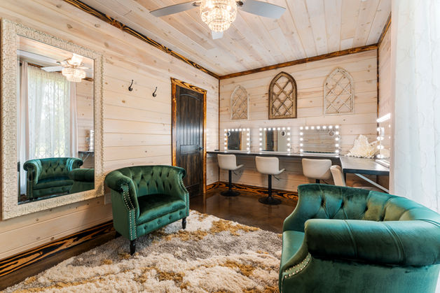 Grooms lounge with TV, game console, and private bathroom/shower